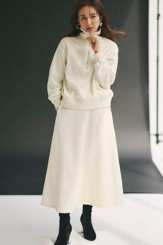 ■特長:衿から胸元にかけてのハーフジップがアクセントのプルオーバーとフレアスカートのセットアップ。裏起毛のあったか素材がおしゃれと着心地の良さの両方を叶えます。