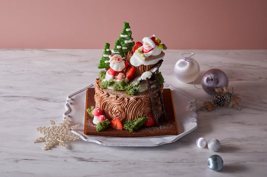毎年人気のブッシュ・ド・ノエルは、カカオ分72%のスイスチョコレートを使用した濃厚でリッチなクリームとスポンジ生地を巻き上げた切り株の土台に、仲良く遊ぶサンタクロースとスノーマンがまるで絵本の世界から飛び出したような可愛らしいケーキに仕上がりました。