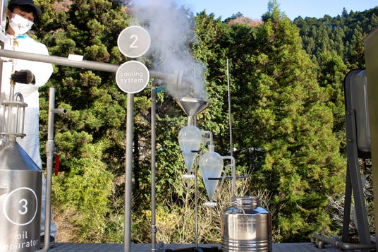 「モバイルアロマラボ」は、トラックに蒸留器を搭載した移動式蒸留装置です。エッセンシャルオイルの原料となる植物の魅力を発信することや未利用資源の活用などを目指し、日本全国の原材料の植物の産地まで赴き、精油の蒸留を行っています。これまでに、柚子・直七(高知県)、高野槙(奈良県)、三ケ日青ミカン(静岡県)、檜原村ヒノキ(東京都)などの蒸留を実施しました。