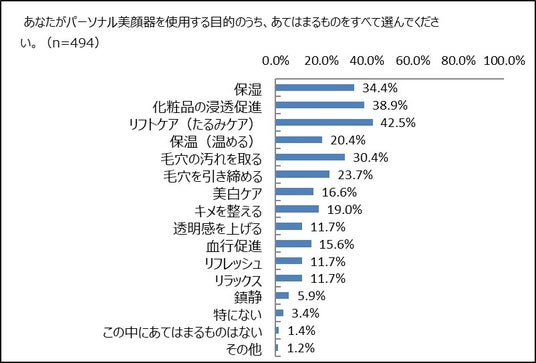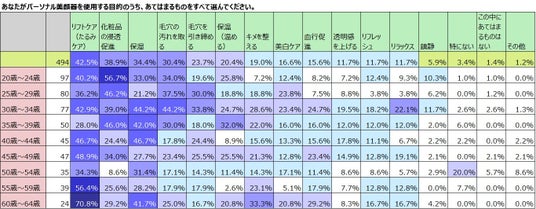 使用目的、若年層は「化粧品の浸透促進」が多く、50代を超えると「リフトケア」が激増。