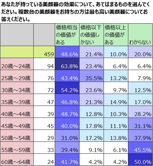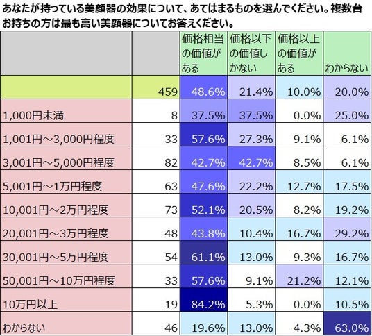 5万円以上の美顔器、「価格以上の価値」2割超。「価格相当」と合わせると約8割。