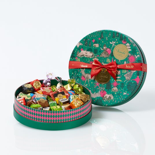 落ち着いたグリーンを基調に鮮やかなピンクのアクセントが映えるクリスマスハンパー。MY VENCHI MIXで人気のチョコレート24種類59個がアソートされた充実の内容で、ヴェンキのチョコレートの世界を堪能いただけます。