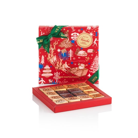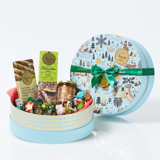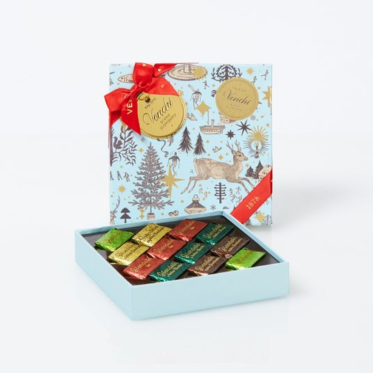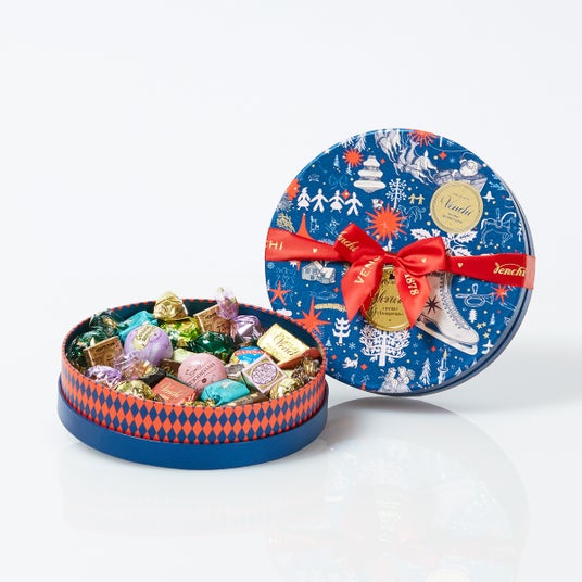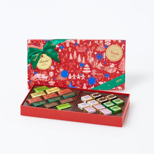 ブルーベースのギフトボックスにレッドが映えるデザインのクリスマスハンパー。MY VENCHI MIXで人気のチョコレート20種類27個をアソートしています。