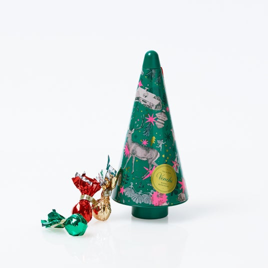 ツリー型の缶のオーナメントにきらめく彗星をイメージしたチョコレート「コメッツ」が3色入っています。深いグリーンに鮮やかなピンクが映えるデザイン。クリスマスツリーやテーブルに飾ってお楽しみいただけます。友人とのプレゼント交換などカジュアルなギフトにもおすすめです。