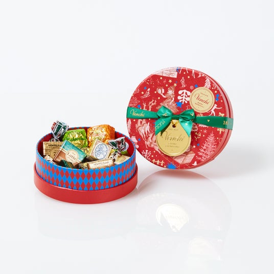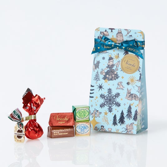 鮮やかな赤を基調にブルーのアクセントが映えるクリスマスハンパー。MY VENCHI MIXで人気のチョコレート8種類14個をアソートしています。