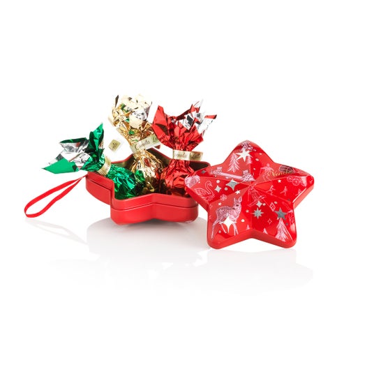 星形の缶のオーナメント。きらめく彗星をイメージしたチョコレート「コメッツ」が3色入っています。クリスマスツリーなどに吊るしてお楽しみいただけます。