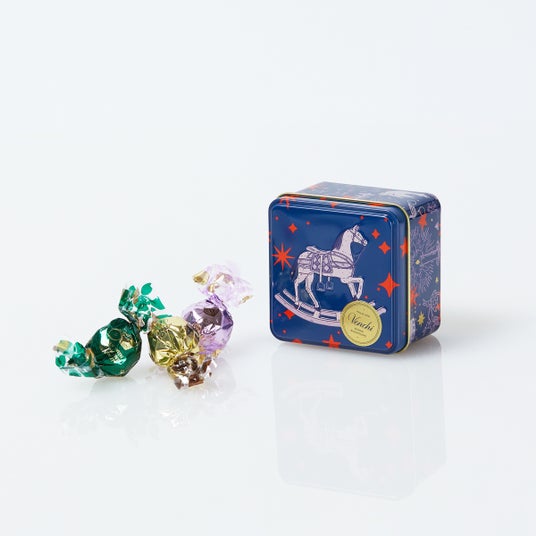 シンプルなスクエアタイプのギフト缶に木馬のイラストを大胆に配置。キラキラした包装の美しいパールシリーズ3種類をアソートしました。