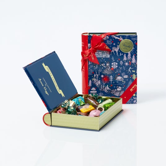 クリスマスの物語が詰まった小さなブック缶。レッドをベースにホリデーシーズンの楽し気な雰囲気を描いた、背表紙の鮮やかなブルーが映えるデザイン。チョコビア6種がアソートされています。