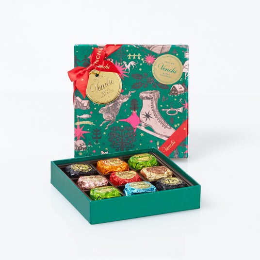 クラシカルな印象のスクエア型のギフトボックス。グリーンを基調としたノスタルジックなデザインのギフトボックスには、ヴェンキのアイコニックなチョコレート「チョコビア」7種が詰まっています。