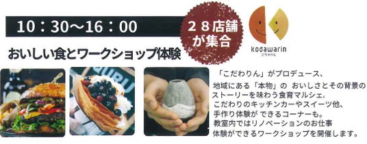 本物のおいしさと、その背景のストーリーまるごと味わう食育のマルシェです。こだわりのキッチンカーやスイーツ他、手作り体験ができるコーナーも。すべて手作りで作られたラザニアを提供する「ラザーニャカサネール」、自家製天然酵母でつくられるバインミー「ハーバルキッチン Banh Mi Co」、米粉を使用でアレルギーのある子も安心な焼き菓子を提供する「rice flower」など、こだわりの食体験ができる一日です。また、「和菓子職人が教える本格ねりきり作り」や「モザイクタイルを使って好きな色・形を貼って作ろう!」、「もちもち~!米粉で肉まんをつくろう!」など、ご来場者さま全員がその場で貴重な体験ができるブースも多数出店いたします。