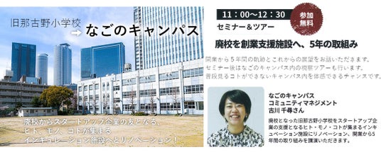 廃校となった旧那古野小学校をリノベーションし、スタートアップ企業を支援するインキュベーション施設として生まれ変わらせるまでの取り組みを講演いただきます。『なごのキャンパス』の普段見れないキャンパス内を視察できる無料ツアーもセミナー後に開催します。