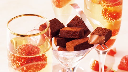 砂糖や洋酒などに漬けたいちごにシャンパンをそそいだカクテル「ストロベリーシャンパン」をイメージした生チョコレート。ミルクの風味が感じられるチョコレートにストロベリーパウダーとシャンパン ピエール ミニョン、マールドシャンパーニュ、ストロベリーリキュールをブレンドしました。ほのかなストロベリーの酸味とシャンパンの華やかな香りが楽しめる、特別なシーズンにぴったりの味わいです。