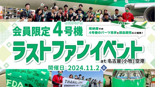 株式会社フジドリームエアラインズ(略称:FDA、本社:静岡県静岡市、代表取締役社長:楠瀬 俊一)は、2024年11月2日(土)にFDA会員の方を対象に「FDA4号機ラストファンイベント at 名古屋(小牧)空港」企画を実施いたします。