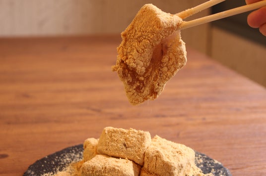 爪楊枝が刺さらない程の柔らかさで、お箸で食べていただく「生わらびもち 和三盆きな粉」(小箱650円、大箱1,200円)。