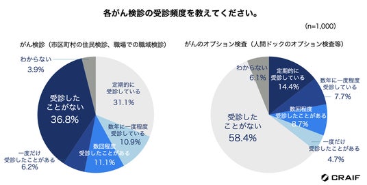 がん検診(市区町村の住民検診、職場での職域検診)の受診頻度を尋ねたところ、「受診したことがない」が36.8%いることがわかりました。また、「数年に一度程度」「数回程度」「一度だけ」と、がん検診が定期的な習慣となっていない層も含めると約7割が定期的にがん検診を受けていなかったことがわかりました。また、がんのオプション検査(人間ドックのオプション検査等)を「定期的に受診している」が全体の14.4%と、がんの早期発見に主体的に取り組んでいる人はごくわずかであることがわかりました。(n=1,000)