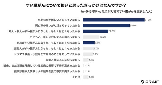 すい臓がんが怖いと回答した方に、そう考えるようになったきっかけについて尋ねたところ、「早期発見が難しいと知っていたから」が51.3%、「死亡率の高いがんだと知っていたから」が38.9%と回答。すい臓がんを怖いと思っている約4割が、すい臓がんの早期発見の難しさや死亡率の高さについて意識していることがわかりました。また、「知人・友人がすい臓がんになった、もしくは亡くなったから」が21.0%、「家族がすい臓がんになった、もしくは亡くなったから」が9.8%と、身近な人がすい臓がんにかかることを経験している人が多くいることがうかがえました。(n=643/怖いと思うがん種ですい臓がんを選択した人)