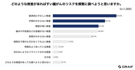 どのような特徴のある検査があれば、すい臓がんのリスクを頻繁に調べようと思うか尋ねたところ、「経済的にやさしい検査」が64.8%、「手間がかからない検査」が53.2%、「精度が高い検査」が46.6%と続きました。(n=1,000)