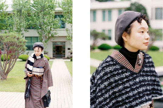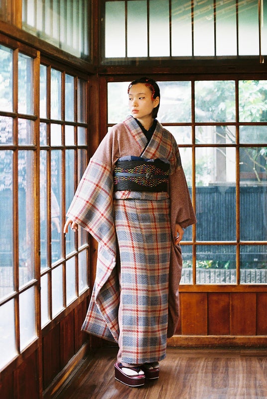 <きもの / uniform >大胆なチェック柄は、無地のツイードと組み合わせることで、ポップで個性的なふりそでに。スーツなどにも使用され、きちんとした印象を与えるチェック柄も、サイズ感と配色でカジュアルで華やかな印象になります。1887年創業の「三星毛糸」の生地を使用しており、トラディショナルで質の高さを感じられるふりそでです。 価格:132,000円(税込・仕立て付き)
