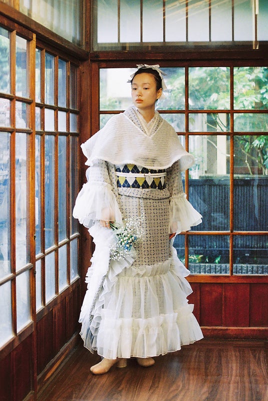 <きもの / veil >ベールに包まれたようなミステリアスな雰囲気が魅力的なふりそでです。エールを贈る旗に見立てた、フラッグモール糸(旗のような不織布がついた糸)を織り込んだふりそでに、ベールを纏うようにレースを装飾しています。創業128年を迎え、世界のメゾンからも信頼される米沢織の織元の方と共に製作いたしました。 価格:165,000円(税込・仕立て付き)