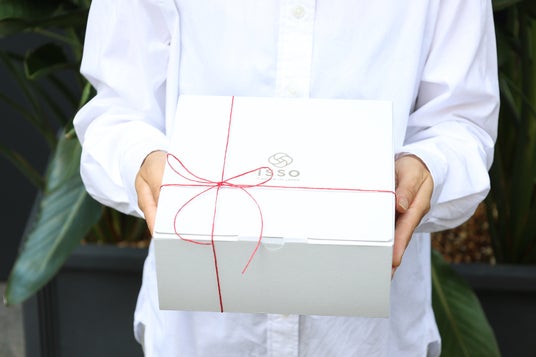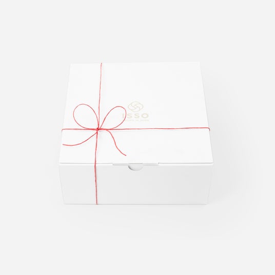 3. 環境に配慮したギフトボックス:ISSOのロゴを銀で箔押ししたホワイトボックスに、落ち着いた赤い紙紐リボンをおかけします。ギフトをお楽しみいただいた後も、そのまま箱としてお使いいただきやすいようなかたちにデザインされ、ボックスは循環型素材でリサイクルいただくことができます。