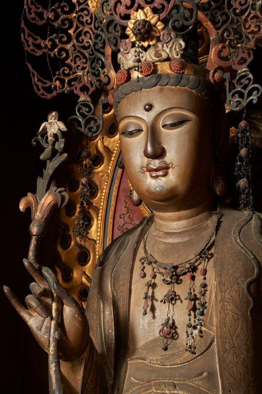 800年の時を越え、色鮮やかに護り受け継がれる泉涌寺の秘宝。楊貴妃観音像泉涌寺の大門をくぐってすぐ左手奥にある御堂には、寛喜2年(1230)に南宋から請来した木像の聖観音(楊柳観音)が安置されています。像容の美しさから、玄宗皇帝が亡き楊貴妃の面影を写させて造像したとの伝承を生み、江戸時代初め頃から「楊貴妃観音像」と呼ばれ信仰される泉涌寺の秘宝です。