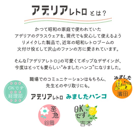 「先生とのやり取りで使えるかわいいハンコがほしい!」という声から企画。昭和レトロの代名詞・アデリアレトロのデザインを使った“みましたハンコ”が登場。学校の先生はもちろん、社内でのやり取りにも。