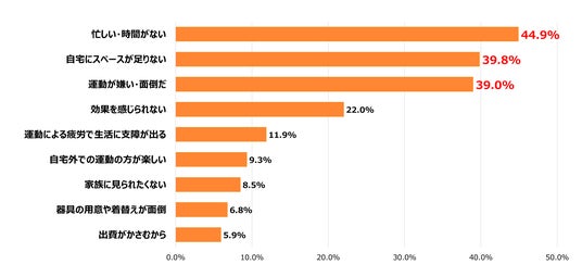 “自宅で運動したい”と回答した中で、現在自宅で運動をしていない方に向けて「なぜ、自宅で運動をしていないか」を尋ねると、最も多い回答は、“忙しい・時間がない”(44.9%)、続いて“自宅にスペースが足りない”(39.8%)、“運動が嫌い・面倒だ”(39.0%)という結果になりました。約4割の方が、自宅で運動したくても自宅のスペースの狭さが要因で運動の機会を無くしてしまっていることがわかりました。