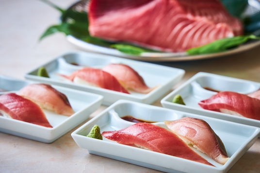 <ランチタイム>深い赤色の身と、ふくよかな味わいと口の中でほどけるような舌触りの「本鮪」と白身魚を握り寿司でご賞味ください。