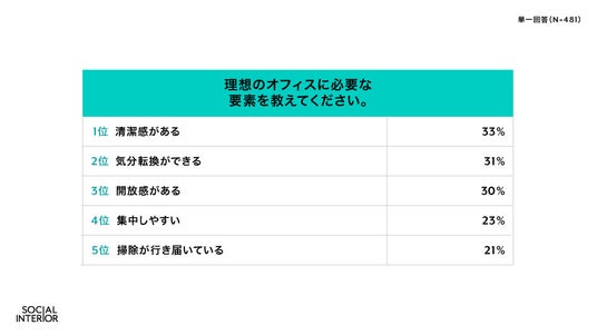 – 理想のオフィスに必要なのは、「清潔感(33%)」と「気分転換ができる開放感(31%)」!企業規模によって求める要素に差が見られる結果に