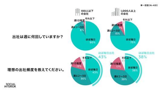 約7割がほぼ毎日出社。会社の規模が小さいほど出社率が高く、毎日出社を希望する人も多数