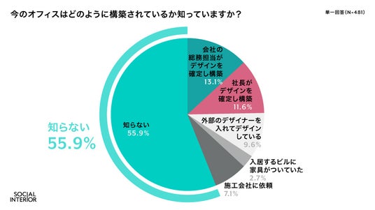 オフィスの存在や働く環境の重要性が浮き彫りとなった一方で、自社オフィスの構築方法を「知らない」と回答した人は全体の55.9%と過半数に上りました。この結果は、多くの企業でオフィス構築の過程が従業員とあまり共有されていない実態を明らかにしています。