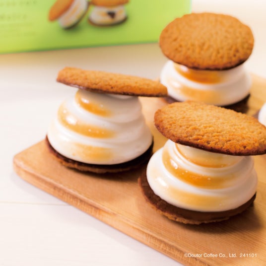 香ばしいグラハムクッキーに挟まれた、こんがり焼けたマシュマロと、ほどよくとろけたチョコレートが美味しい焼マシュマロスイーツ。マシュマロのふわふわ食感(触感)と、とろけだすチョコレートをプラスすることで、《しっとりクッキー×ふわふわマシュマロ×なめらかチョコレート》と幾重にも変わる食感の驚きを加えました。淹れたてのコーヒーとのハーモニーをお楽しみください。