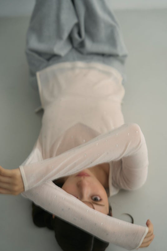 透け感のあるメッシュベロアに、ランダムにラインストーンをあしらった華やかなトップス。
