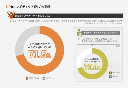 セルフボディケアに取り組む人のうち「セルフボディケアをするにも労力がかかる」と感じている人は71.5%という結果に。また、セルフボディケアをしていない人のうち、70.4%が「『セルフボディケアをしなければ』という義務感がストレスに感じる」と回答したことから、セルフボディケアは疲れを癒すための行動であるはずが、それ自体が疲れの原因になってしまっている、という「セルフボディケア疲れ」の実態が見えてきました。
