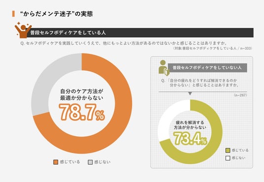 また、日頃からセルフボディケアに取り組んでいる人のうち78.7%が「他にもっといい方法があるのでは」と回答しました。一方で、セルフボディケアをしていない人は73.4%が「自分の疲れをどうすれば解消できるのか分からない」と感じていることが明らかになりました。