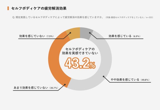 からだの疲れの悩みについて、「疲れやすい」(69.0%)に続き、「疲れがとれにくい」と答えた人は全体で58.8%にのぼり、慢性的に疲れを感じている人が多く、疲れを感じる部位についても、「首や肩のコリ」(71.3%)に続き、「目の疲れ」(63.0%)や「脚のむくみ」(43.7%)、「腰痛」(42.2%)、「背中のハリ」(24.7%)など、頭からつま先まで全身様々な部位で疲れを感じる人が多いことがわかりました。また、セルフボディケアをしている人のうち43.2%が「効果を実感できていない」と回答したことから、これまでのセルフボディケアは疲れに対して効果を実感できていない人が見られることが明らかに。そこで、セルフボディケアの実態を探ってみました。