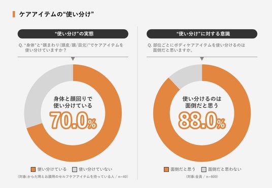 実際、からだ用とお顔用の複数のセルフボディケアアイテムを使用している人のうち70.0%が「使い分けている」と回答した一方で、全体の88.0%がボディケアアイテムを使い分けることに面倒と感じていることが明らかになりました。全ての部位を1つのアイテムで楽にケアしたいと考えている女性が多いようです。