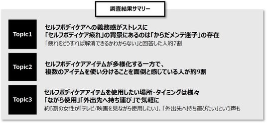 以上の結果から、「セルフボディケア疲れ」の背景には、様々な部位の疲れを癒す適切な“セルフボディケア”を見つけられていない「からだメンテ迷子」の存在があると考えられます。