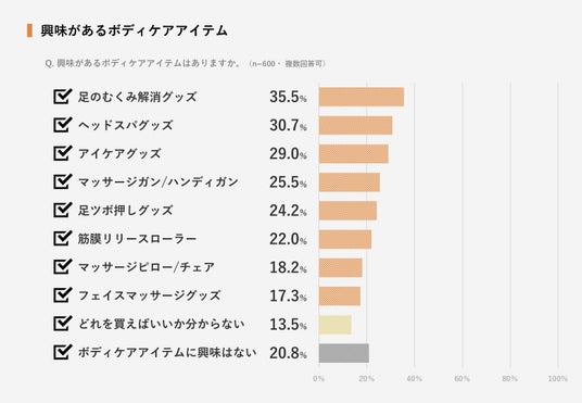 セルフボディケア方法の1つとして自分で手軽に使える「ボディケアアイテム」について、興味があるボディケアアイテムを聞いたところ、足のむくみ解消グッズ(35.5%)、ヘッドスパグッズ(30.7%)、アイケアグッズ(29.0%)と続き、興味のあるアイテムは多様化し、身体だけでなく「頭皮や目もケアしたい」というニーズが存在することがわかりました。