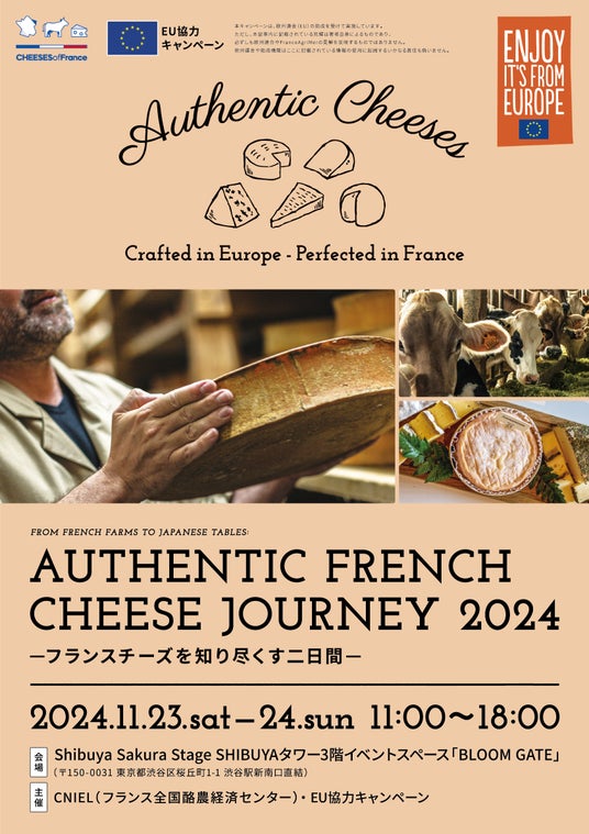 CNIEL(フランス全国酪農経済センター)は、欧州連合 (EU)の支援を受け、11月23日(土)と24日(日)の2日間、フランス産チーズを楽しみつくすイベント「Authentic French Cheese Journey 2024 ~フランスチーズを知り尽くす二日間~」を、Shibuya Sakura Stageにて開催します。