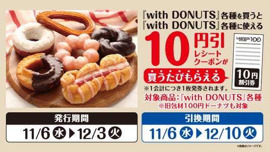 さらに2024年11月6日(水)から2024年12月3日(火)まで、対象の『with DONUTS』を購入すると、次回『with DONUTS』各種購入時にご利用いただける10円引クーポンを進呈するお得なキャンペーンを実施いたします。是非このお得な機会に『with DONUTS』をお楽しみください。
