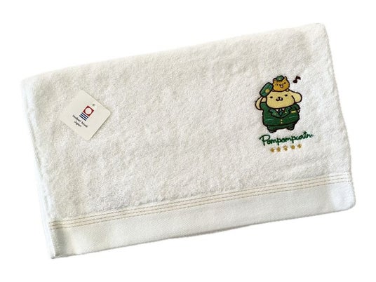 ポムポムプリンのワインポイントが刺繍されたやわらかい肌触りの今治タオル。