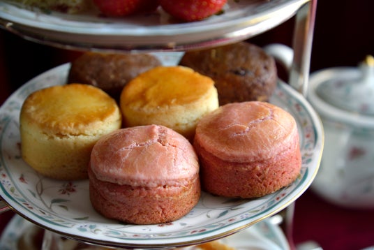 中段のスコーンは、伝統の「プレーンスコーン」のほか、ココアパウダーをベースにした生地にミックスベリーをたっぷり混ぜ込んだ「ミックスベリーのスコーン」、いちごを練りこんだスコーンにバラが香る生地を重ねた2種の味わいが楽しめる「いちごとバラのスコーン」の3種をご用意。通常のクロテッドクリームの他、いちごとラズベリーのコンフィチュール、ミックスベリーのクロテッドクリームを添えてお召し上がりください。