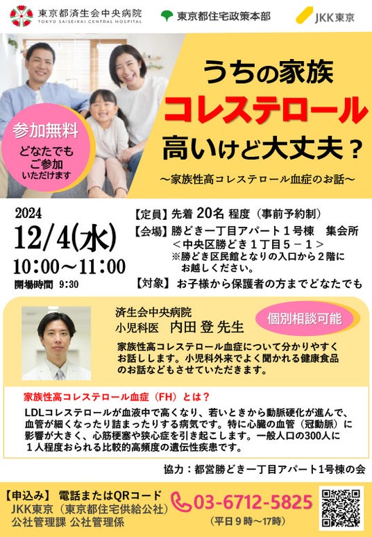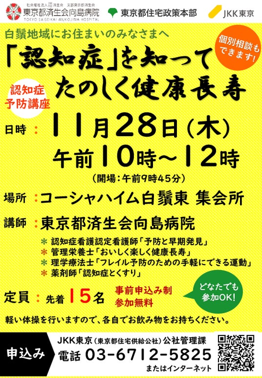 JKK東京(東京都住宅供給公社:東京都渋谷区、理事長:中井敬三、以下「JKK」)は、東京都、社会福祉法人恩賜財団済生会支部東京都済生会(支部長:杉村栄一、以下「済生会支部東京都済生会」)と連携し、11月28日(木曜日)と12月4日(水曜日)に、墨田区と中央区において、子育て世帯向けや高齢者向けのイベントを3者共催で実施します。