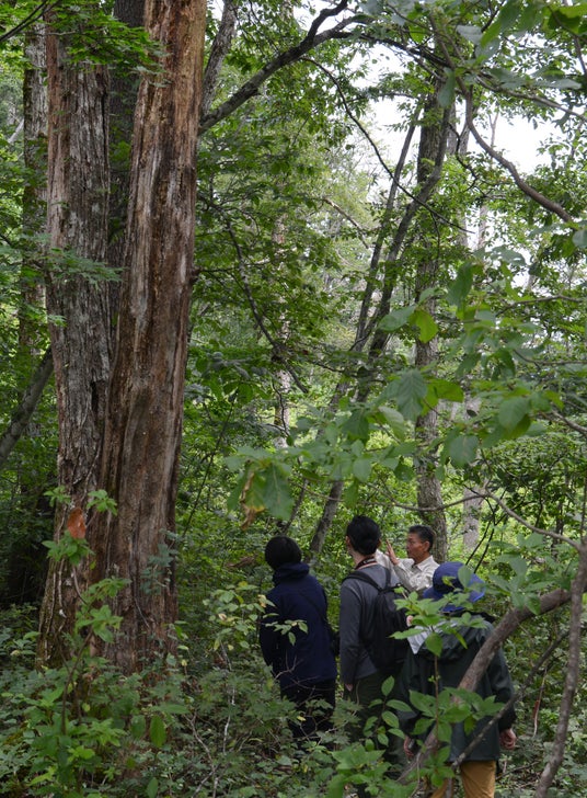 飛騨の森を歩く三澤 遥氏と三澤デザイン研究室のメンバー