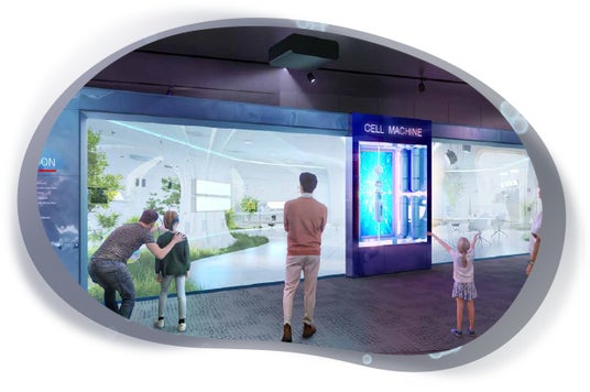 ▲「再生医療が身近になった2050年のミライ社会」を表現した展示ブース(イメージ図)