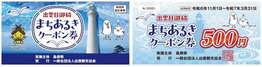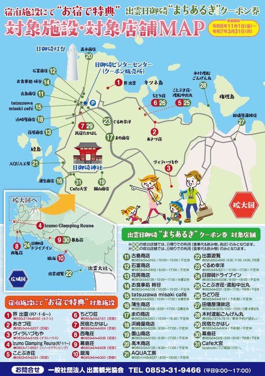 2. 出雲日御碕“まちあるき”クーポン券は、指定宿泊施設にご宿泊された場合、その施設内にある売店でのご利用のみ可能です。(詳細は各施設にお問い合わせください)