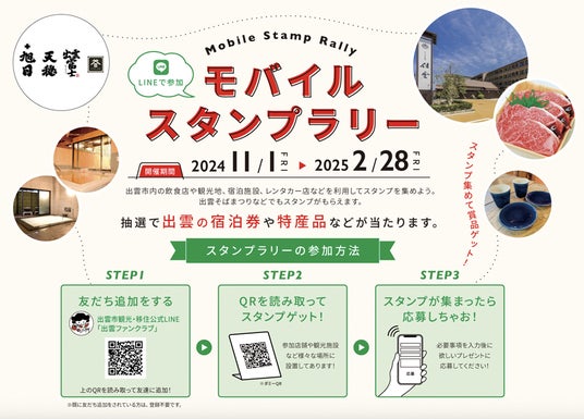 まず、神門通りを含む出雲市内の各エリアにある店舗で、LINEを利用したモバイルスタンプラリーを実施。参加者が市内飲食店や観光施設などを周遊してスタンプを集めることで、抽選で出雲の特産品が当たります。