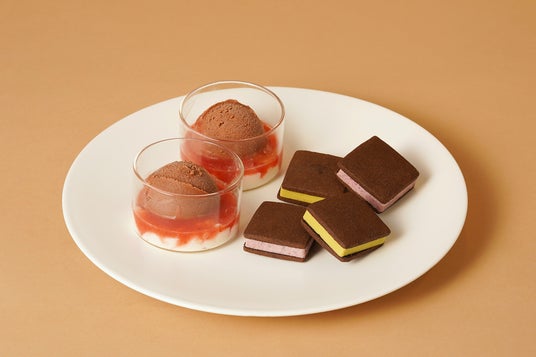 植物や花のような豊かな香りのチョコレート「SAVORY」を使ったチョコレートアイスに、甘酸っぱく香り高い苺”女峰”を使ったソース、さらにミルクジュレを合わせました。