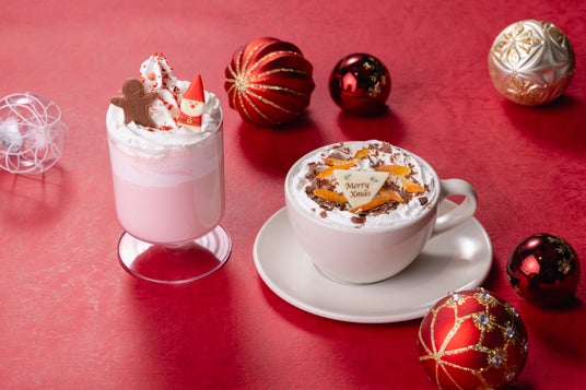 (左)ストロベリーショートケーキ (クリスマスデコレーション) (右)オレンジホットショコラ (クリスマスデコレーション)